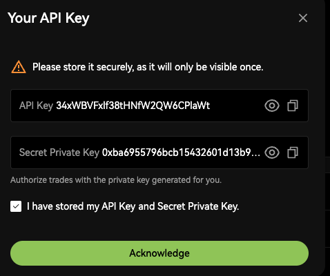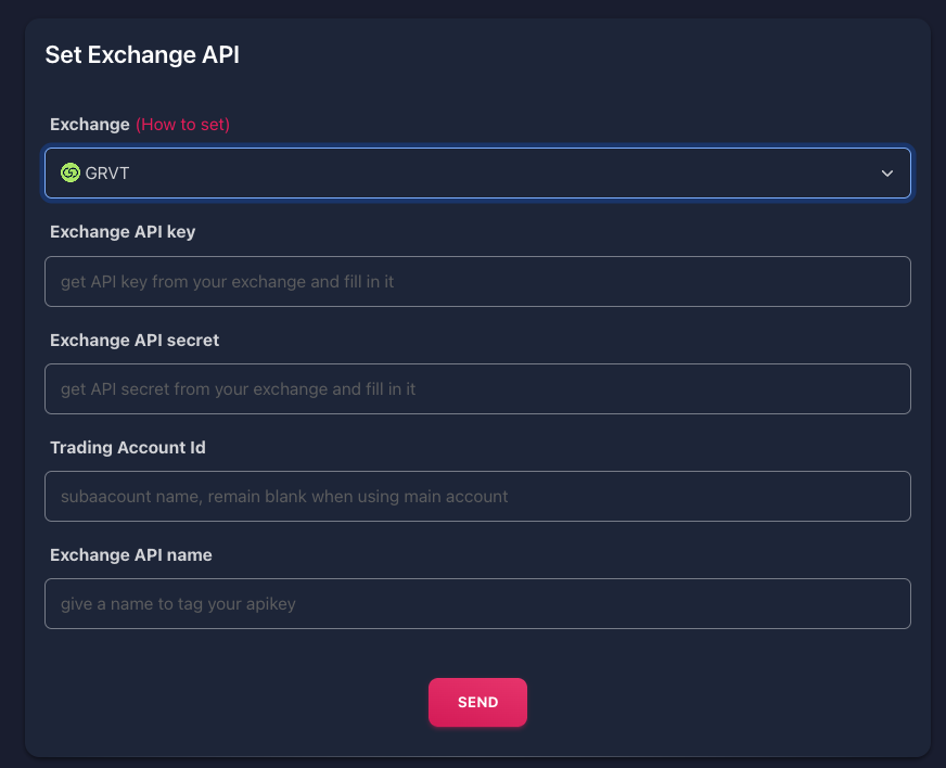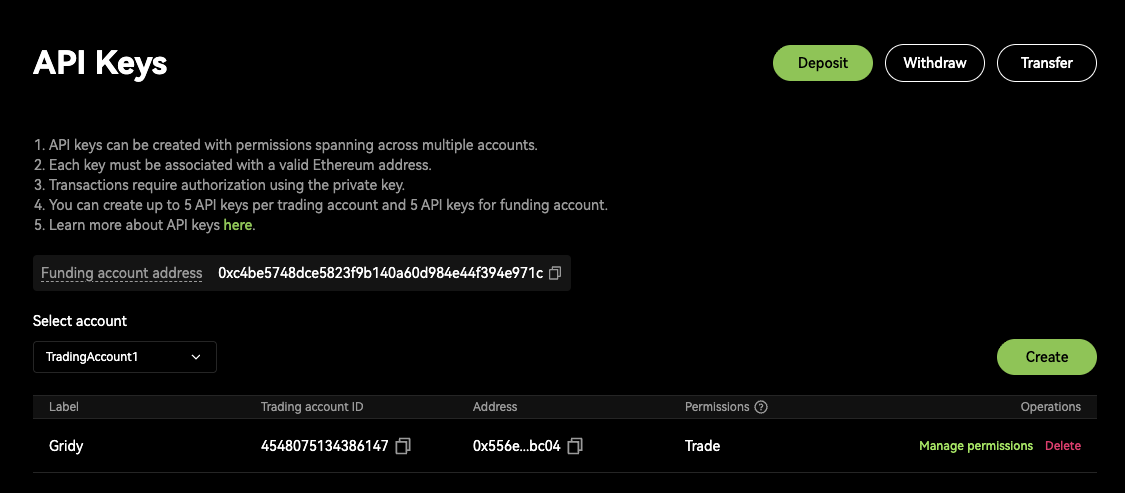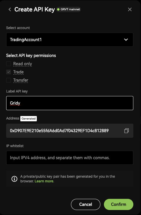 3. Copy API Key and Secret Private Key into Gridy Set Exchange API page. Keep your Secret Private key safe, don’t leak out. You can find Trading Account Id on API Keys page https://grvt.io/exchange/account/api-keys .